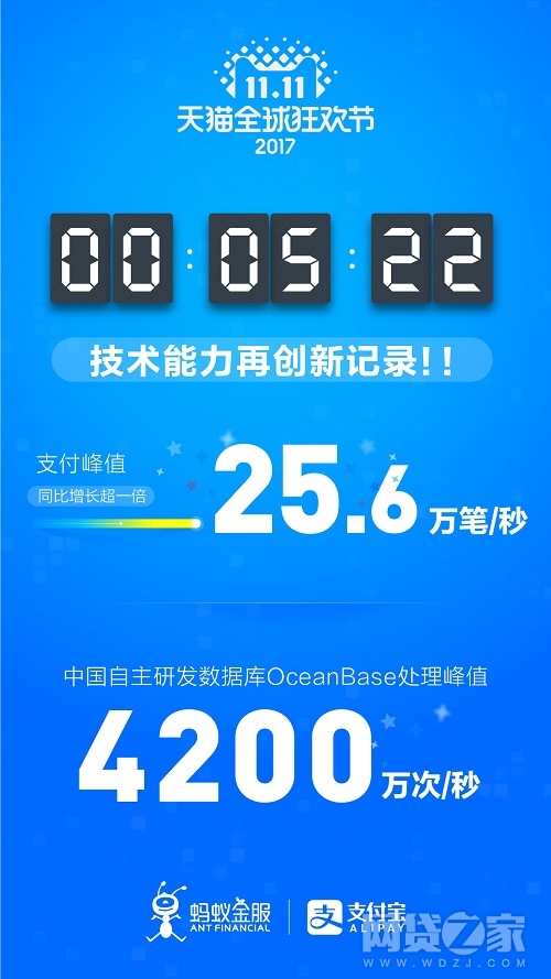 网络整理 2021-03-22 19:11网贷之家讯 2017年11月11日凌晨,天猫双11全球狂欢节刚开场5分22秒,新的支付峰值诞生:25.6万笔/秒,比去年增长超1.1倍,再次刷新全球纪录。同时诞生的还有数据库处理峰值,4200万次/秒。