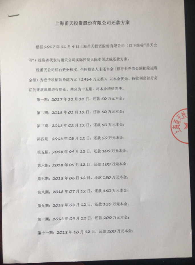 几天前,甬天投资在官网公布了投资者代表与甬天投资实控人陈孝国达成的兑付方案。该方案以本金优先、代收利息部分劣后的还款原则进行偿还,全体投资人未还本金1964万元共分十五期清偿,预计到2019年2月12日清偿完毕。本金清偿后,代收利息部分以每月为一期,每期不低于待售部分2%予以偿还,约定每月12日为偿还日。