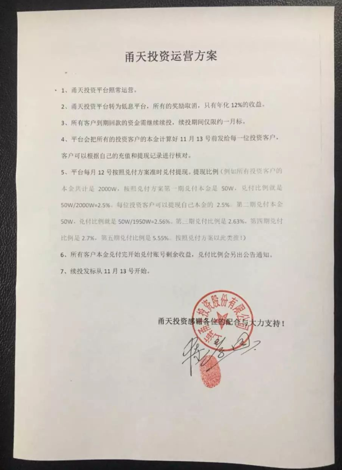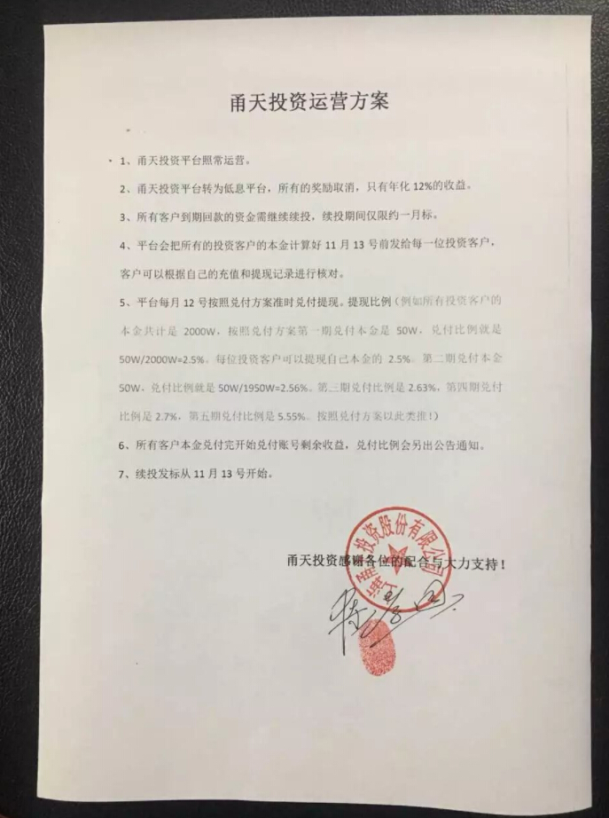 11月8日,上海甬天投资股份有限公司(下称“甬天投资”)在其官网上公布了最新的运营方案:所有客户到期回款资金需继续续投一月标,每个月12号兑付,每一期兑付2.5%。