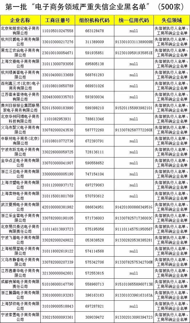 国家信息中心副主任周民表示,在全国信用信息共享平台上有关部门共享的黑名单信息中,经分析比对,共梳理出电子商务黑名单企业6440家,其中首批500家已在“信用中国”网站(点击【详情】跳转)公布。