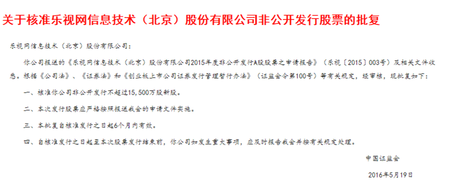 2016年5月,乐视网通过非公开发行股票,再度筹资48亿元