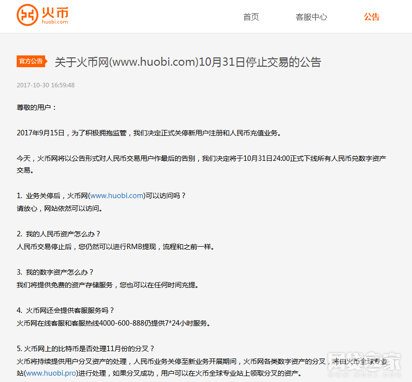 网络整理 2021-03-22 19:20网贷之家讯 10月30日,火币网发布《关于火币网10月31日停止交易的公告》(下简称“公告”)。公告称,为积极拥抱监管,火币网决定正式关停新用户注册和人民币充值业务。将于10月31日24:00正式下线所有人民币兑数字资产交易。值得注意的是,业务关停后,其网站可以继续访问,用户能正常提现RMB,另外该平台还会继续为用户提供免费的资产存储服务。