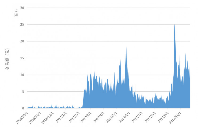 与BTC-CNY场内交易对比可以看出恰恰相反的走势,如图3所示,2-5月是场内交易规模的低谷,6-8月场内交易规模显著提升,9月份以来持续走低。从交易规模对比上看,目前P2P模式的BTC-CNY日均场外交易金额仅为前期场内交易金额的1/100左右。