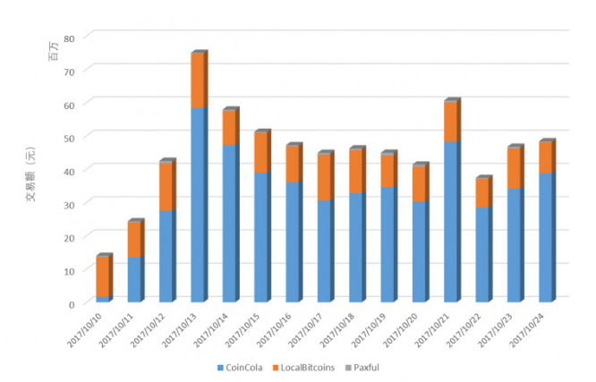通过对近两周LocalBitcoins,Paxful,CoinCola三家平台的BTC-CNY交易数据进行分析,从交易规模上看,三家平台合计交易额6.8亿元,其中香港的CoinCola平台交易额增长显著,在三家平台中占比达七成。下图给出了三家平台近两周的交易额对比情况。