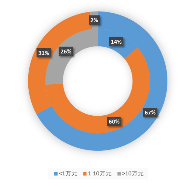 从三家平台的订单规模来看,单笔交易金额小于1万元的订单数量占比67%,订单金额合计占比14%;单笔交易金额1万-10万元的订单数量占比31%,订单金额合计占比60%;单笔交易金额大于10万元的订单数量占比2%,订单金额合计占比26%。具体分布如图5所示。