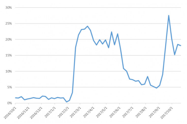 BTC-CNY场外交易规模走势如图1所示(注:采用LocalBitcoin及Paxful两家平台交易数据)。可以看出,2017年2月以前,BTC-CNY场外交易额相对较小。随着2月初国内主要比特币交易平台禁止提币,交易规模出现爆发式增长。自2017年6月国内主要交易平台开放提币以来,交易规模明显减少。随着9月初国内ICO和比特币交易的业务清理,场外交易再一次繁荣。从LocalBitcoin及Paxful两家平台交易数据来看,BTC-CNY场外交易量占其比特币场外交易总量的份额从5%左右上升至20%左右,具体走势如图2所示。