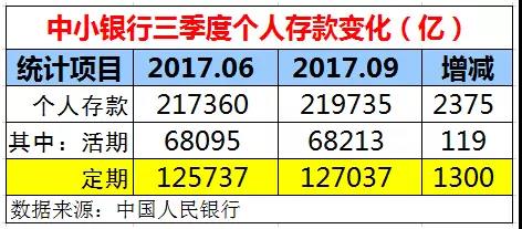 然而,2017年第三季度,银行的个人存款恢复了正常的增长,这一季度增加了5452亿元,环比增长了0.9%。