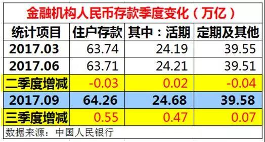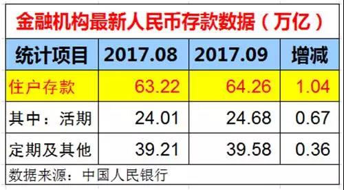 根据央行最新公布的数据,2017年9月底金融机构住户(个人)存款余额宝为64.26万亿元人民币,环比8月数据增加了1.04万亿元,其中,活期存款增加0.67万亿元,定期存款增加了0.36万亿元。