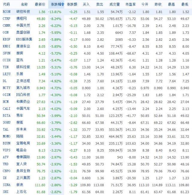 中国概念股周四普跌,其中跌幅较大的公司包括:寺库(跌5.27%)、搜狐(跌3.84%)、陌陌(跌3.47%)、唯品会(跌3.21%)、宜人贷(跌2.95%)、新浪(跌2.92%)、58同城(跌2.71%)、微博(跌2.40%)、京东(跌2.33%)、欢聚时代(跌2.31%)、一嗨租车(跌2.06%)、聚美优品(跌2.02%)、凤凰新媒体(跌1.67%)、百度(跌1.63%)和猎豹移动(跌1.50%)。
