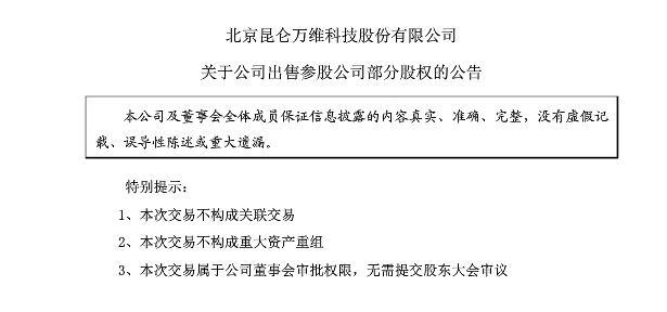 现因趣店IPO超额配售,昆仑万维方面拟再增加出售趣店股份1,764,676 股,价格为每股24美元,交易金额为4235万美元,获得收益人民币2.588亿元。 本次交易及趣店超额配售完成后,昆仑集团仍将持有趣店IPO后股权不完全 稀释的16.86%的股权。