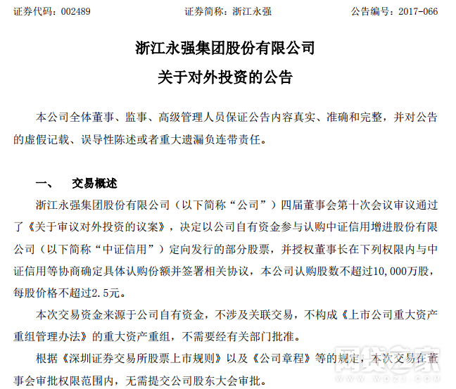 网络整理 2021-03-22 19:32网贷之家综合 10月16日晚间,A股上市公司浙江永强(002489)发布公告,称为探索更丰富的盈利与投资模式,公司拟以2.5元/股的价格,认购中证信用增进股份有限公司1亿股定向发行股票,交易后公司将出资2.5亿元获中证信用2.18%股权。