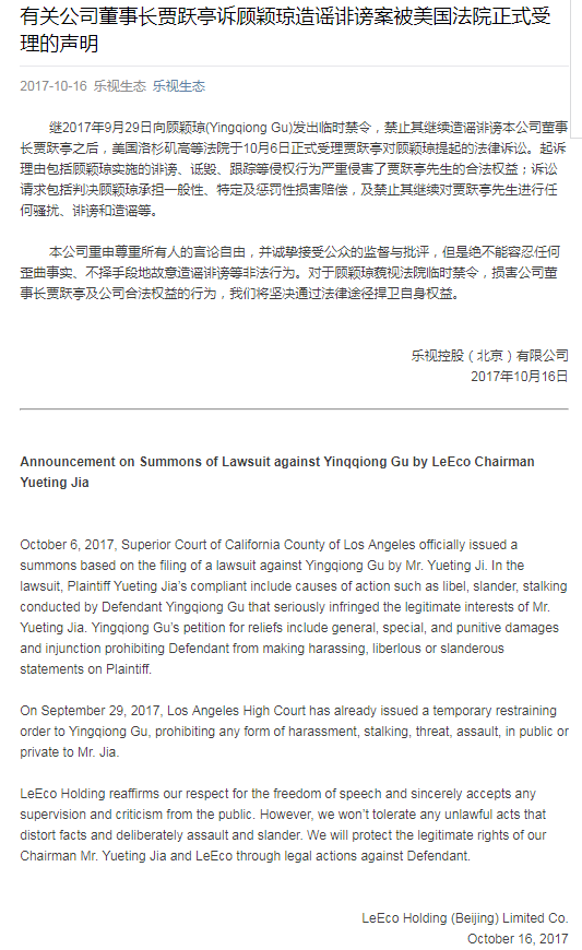 网络整理 2021-03-22 19:32乐视控股今天(10月16日)上午在官方微信公众号乐视生态上发布声明称,继2017年9月29日向顾颖琼(YingqiongGu)发出临时禁令,禁止其继续造谣诽谤本公司董事长贾跃亭之后,美国洛杉矶高等法院于10月6日正式受理贾跃亭对顾颖琼提起的法律诉讼。