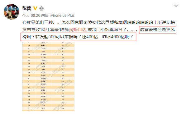 (网贷之家注意到,蚂蚁金服集团董事长彭蕾今日凌晨也在微博质疑,称这富豪榜还是抽风榜?并直言转发超500是否可以举报,还对自己上榜的400亿表示质疑,称咋不4000亿呢?)