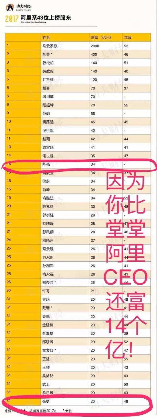网络整理 2021-03-22 19:34胡润研究院10月12日发布了《胡润百富榜2017》,其中阿里系有43位股东上榜。而让胡润没有料到的是,在榜单发布后,就遭遇到了阿里系上榜者的质疑。蚂蚁金服副总裁陈亮称“光我的身家就有34个亿,比阿里巴巴CEO张勇还多”。