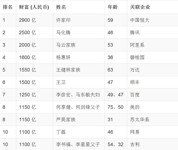 此外,碧桂园杨惠妍、“快递大王”顺丰王卫和吉利李书福、李星星父子,新进入前十。