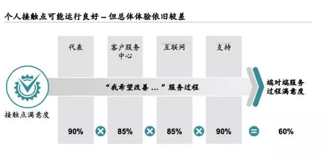 另一方面,银行的内部体系中,用户的体验涉及到非常多环节,在其中每一个环节都出现一点点瑕疵,最后都可能造成令人失望的结果。也就相当于,如果每个环节都只能做到90%,在多个环节之后就只剩下不及格的成绩。