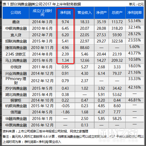 公开信息显示,2017年上半年,中银消费金融、招联消费金融、捷信消费金融、2345贷款王的净利润,分别为6.45亿元、5.41亿元、4.96亿元、2.39亿元。