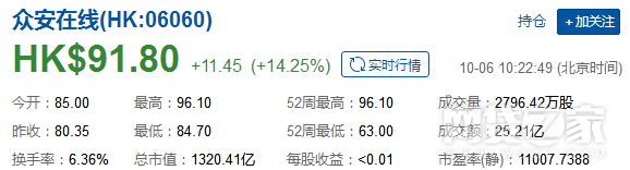 转载请标注:信息网——牛!众安保险再涨14% 市值突破1300亿港元