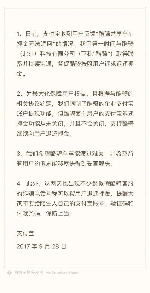 9月28日下午,支付宝方面也针对酷骑单车被曝押金难退一事发布声明称,第一时间与酷骑单车取得联系,督促酷骑按照用户诉求退还押金。