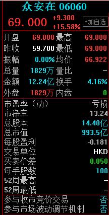 网络整理 2021-03-22 19:42“金融科技第一股”众安在线上市首日大涨15.58%,报价69港元,涉资12.24亿港元,昨日暗盘升近15%。根据公告,众安在公开发售部分超额认购近392倍,触发回拨机制,令公开发售比例由5%增至20%,涉及3.99亿股。
