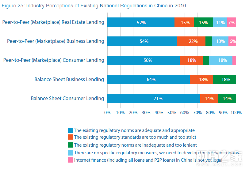 对于目前的监管环境,《报告》亦展现了平台对于地方监管和国家监管认知的调研结果。相比之下,地方监管相比国家监管更加友好。这可能与监管政策是由国家到地方从上至下的传递所导致。此外,不同平台对于监管的认知也有一定差别,以个人信贷业务的平台中,56%的平台认为目前的监管强度适中,5%的平台认为监管宽松,也有一些平台认为监管过于严格。