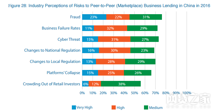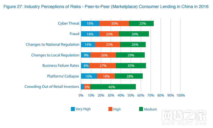 同时,此次《报告》首次调研了行业的风险认知状况。对于从事个人信贷业务的平P2P而言,其感知的风险包括网络攻击(73%)、欺诈(68%)、趋严的政策(65%)、商业失败率(65%)、平台倒闭(62%)和投资者挤兑(55%)。下图的比例图展示了平台对于每个风险的认知程度(中等风险、高风险、极高风险)。