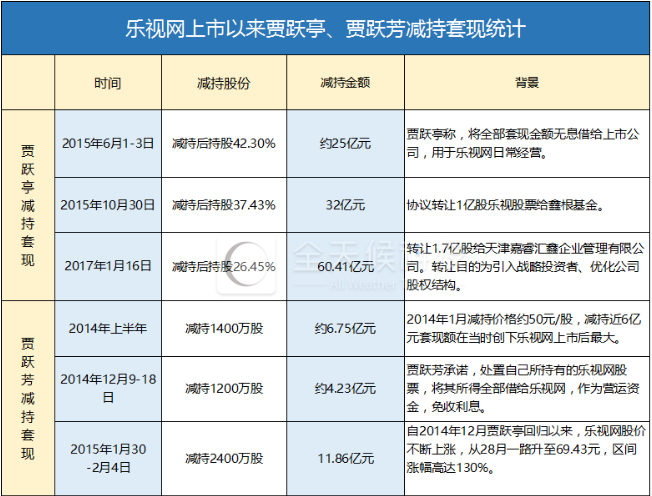 网易财经统计显示,2015年5月开始,贾跃亭拉开了减持乐视股票的大幕。从公开披露的信息看,贾跃亭在2015年6月1日—6月3日,2015年,10月30日,和2017年1月16日,三次大规模减持乐视股票,共计套现资金117亿元。贾跃亭与其姐姐贾跃芳累计在乐视网减持套现接近140亿元。
