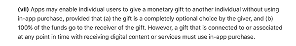 新修改的政策显示:允许个人用户可以在不使用应用内购买的情况下向另一个人赠送礼物。但要求应用开发者不得从现金打赏中抽成,必须把全部打赏交给内容创作者。