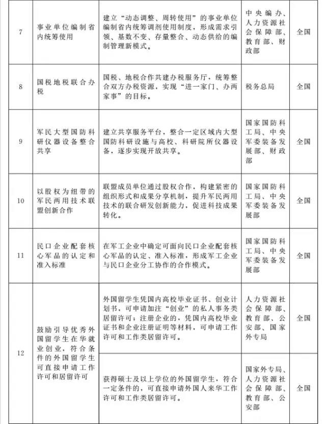 为深入实施创新驱动发展战略,党中央、国务院确定在京津冀、上海、广东(珠三角)、安徽(合芜蚌)、四川(成德绵)、湖北武汉、陕西西安、辽宁沈阳等8个区域开展全面创新改革试验,推进相关改革举措先行先试,着力破除制约创新发展的体制机制障碍。有关地区和部门认真落实党中央、国务院决策部署,在深化科技体制改革、提升自主创新能力、优化创新创业环境等方面进行了大胆探索,形成了一批支持创新的相关改革举措。为进一步加大支持创新的力度,营造有利于大众创业、万众创新的制度环境和公平竞争市场环境,为创新发展提供更加优质的服务,经国务院批准,将有关改革举措在全国或8个改革试验区域内推广。现就有关事项通知如下: