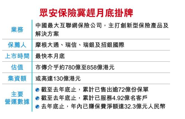 众安保险有望成为本港股市的金融科技第一股,并为随之而来的新经济股份,特别是盛传有意来港上市的另外两只金融科技股,陆金所及蚂蚁金服,作为模楷。