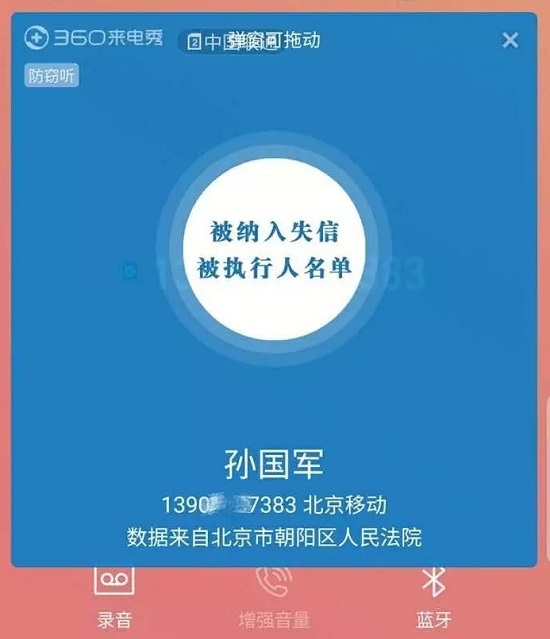 网络整理 2021-03-22 19:55为切实发挥对失信被执行人的信用惩戒功能,敦促失信被执行人履行债务,近日,北京市朝阳区人民法院针对171名被执行人,与360公司达成技术合作,通过360公司旗下累计拥有超过10亿用户的“360手机卫士”APP,协助法院以电话号码标注的方式对上述被执行人进行公布。据悉,这在全国法院尚属首次,是国家司法机关应用“互联网+”与“大数据”的一项重要创新。