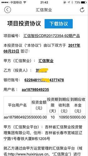 长春的吴越(化名)通过公众号的一篇文章了解到“汇信聚业”日化收益平台,8月17日,抱着试试看的心态,在汇信聚业APP注册并投了2000元,期限是3天,利率是1.28%,收益约76元,当时也曾担心,但回款很顺利。紧接着,吴越又投资了几笔,数额都很小,回款依旧顺利,可是让人没想到的是,最后一笔投了不到一周,APP打不开了,还被客服拉黑了,算下来,损失近10万元。