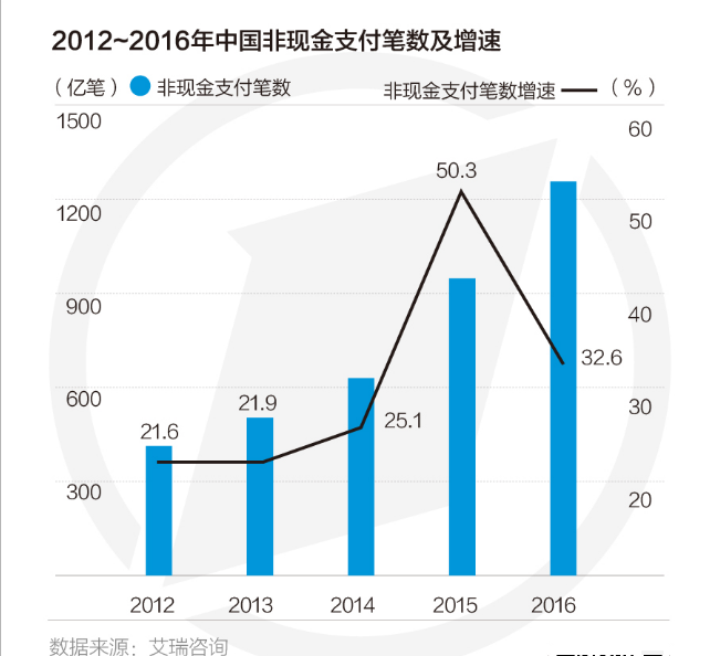 中国人民银行数据显示,自2012年起我国非现金支付笔数增长率超过20%且增速呈上升趋势,大众越来越倾向于选择非现金方式。值得注意的是,2014年起银行卡取现增速开始下降,且在2015、2016年取现金额呈现负增长,这也标志着中国正在逐步走向无现金社会。