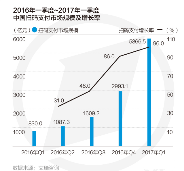 根据《2017年中国第三方支付市场监测报告》,2017年一季度我国扫码支付市场规模预计超过5800亿元,同比增长606.8%。
