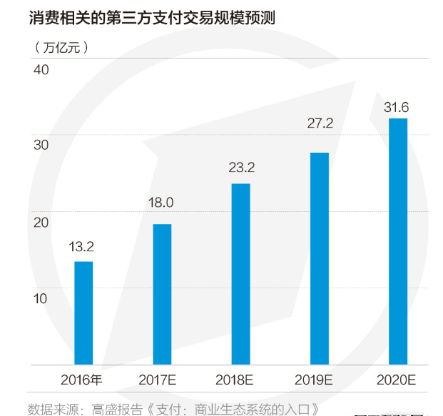 根据高盛的调研报告《支付:商业生态系统的入口》,从2010年到2016年,第三方支付交易规模增长了超过74倍。