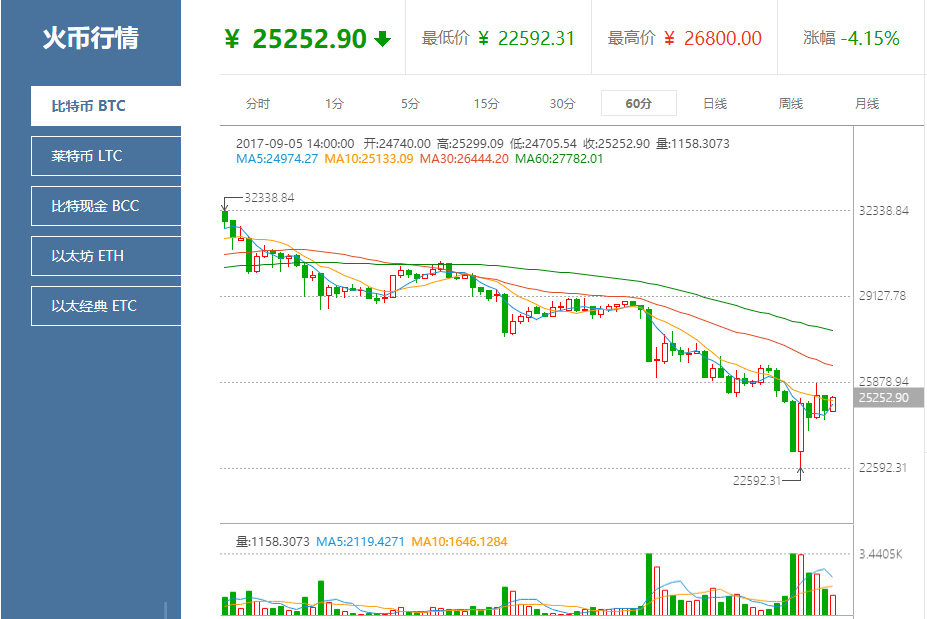 国内交易平台方面,9月5日比特币价格再次遭到重创,比特币盘中连续跌破26000元、25000元、24000元、23000元等多个整数关口。火币网数据显示,最低价曾一度跌至22592.31元,最大跌幅达21%。而OKCoin币行价格则最低达22549.9元,振幅17.56%。