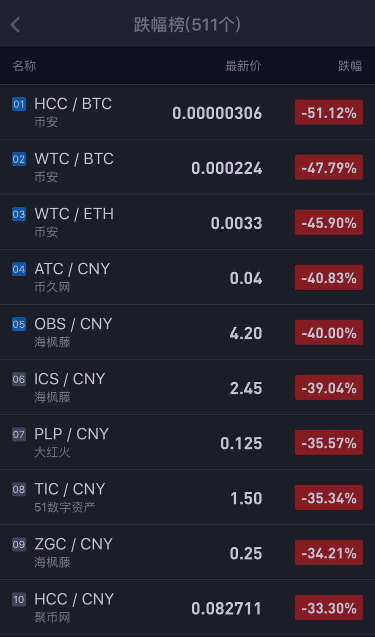 数据显示,目前全球市场上正在交易的580多种数字代币中,约520种处于下跌行情,截至发稿,今日跌幅最大的前五种代币仍保持在50%的跌幅。