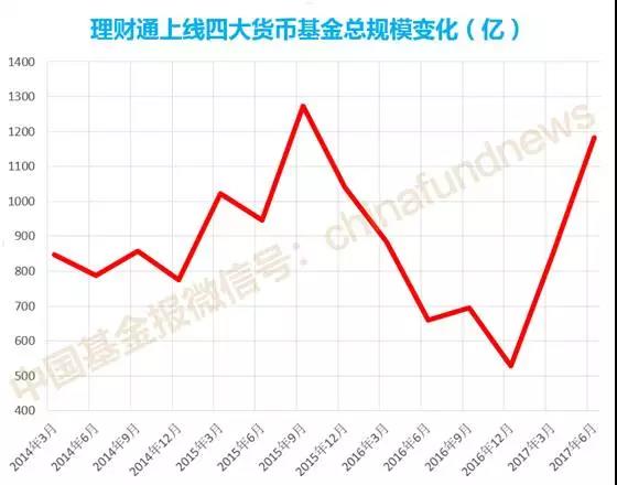 而腾讯理财通对接四只货币基金合计规模不足1200亿元,甚至不及2015年9月底的规模。