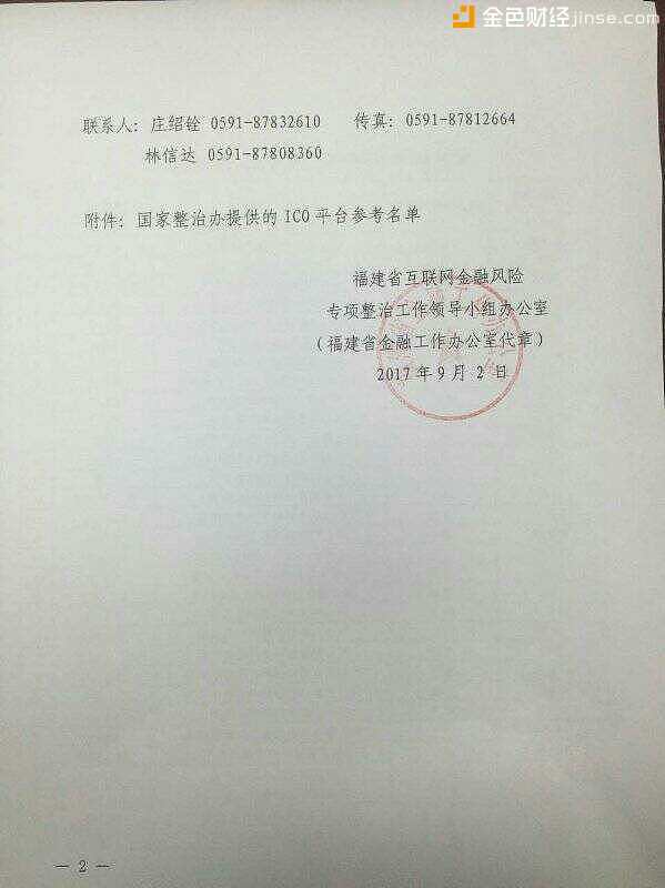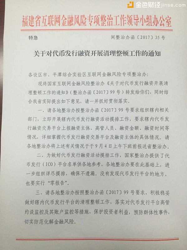 网络整理 2021-03-22 20:019月3日,一份关于福建省互联网金融风险专项整治工作领导小组办公室发布的特急通知,即《关于对代币发行融资开展清理整顿工作的通知》(闽整治办函[2017]35号)(以下简称通知)在网上流传,该通知就当前普遍关注的ICO监管问题提出了清理整顿的工作要求。