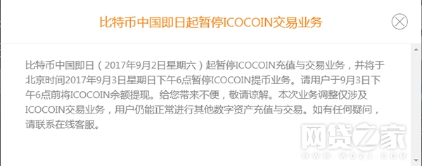 9月2日晚,比特币中国发布公告称,从即日起暂停ICO币充值与交易业务。