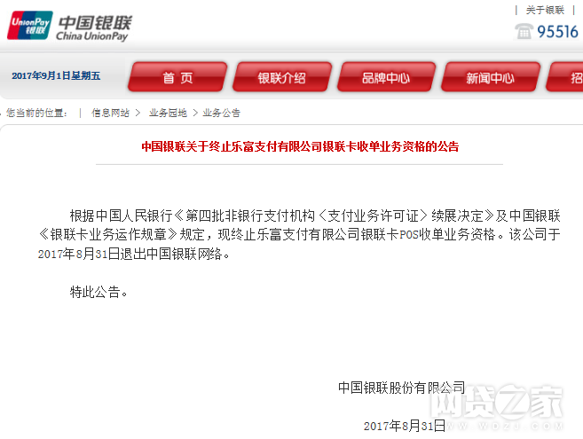 网络整理 2021-03-22 20:03网贷之家讯 近日,中国银联官网发布《关于终止乐富支付有限公司联卡收单业务资格的公告》(下简称“公告”)。公告称,根据中国人民银行《第四批非银行支付机构〈支付业务许可证〉续展决定》及中国银联《银联卡业务运作规章》规定,现终止乐富支付有限公司银联卡POS收单业务资格。该公司于2017年8月31日退出中国银联网络。