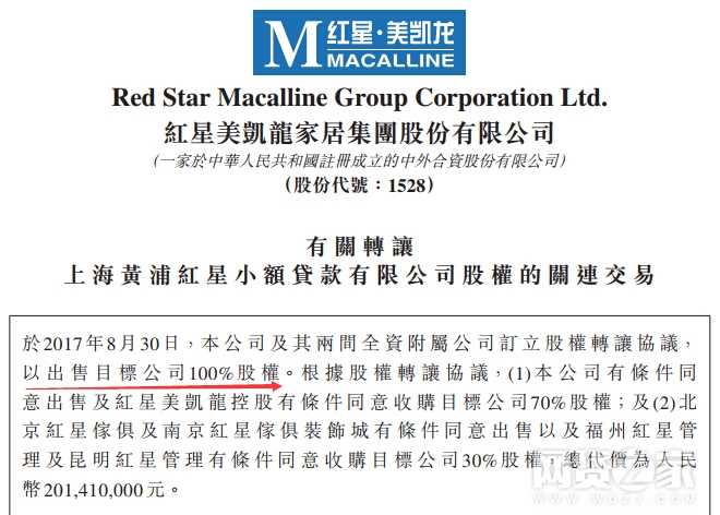 网络整理 2021-03-22 20:04网贷之家讯 8月30日,港股上市公司红星美凯龙(01528.HK)发布公告,宣布出售上海黄浦红星小额贷款有限公司(下文简称“黄浦红星小贷”)100%股权,出售价格为2.014亿元。