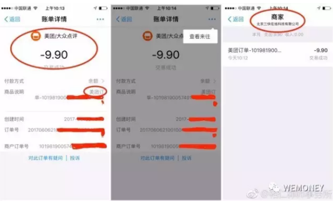 美团的交易记录显示,用户的交易款是由美团的注册公司三快在线代为收取(图片来源:裕仁律师事务所微博)