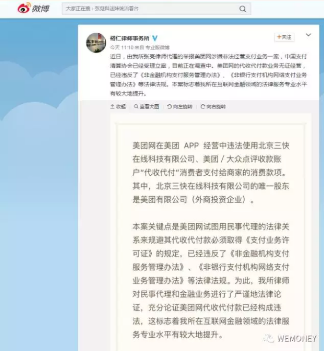 网络整理 2021-03-22 20:048月30日,凤凰WEMONEY注意到,微博实名认证的@北京裕仁律师事务所发布微博称,已向中国支付清算协会实名举报,美团“代收付款”业务涉嫌无证非法经营。据了解,目前中国支付清算协会官网显示举报已经受理,正在调查中。