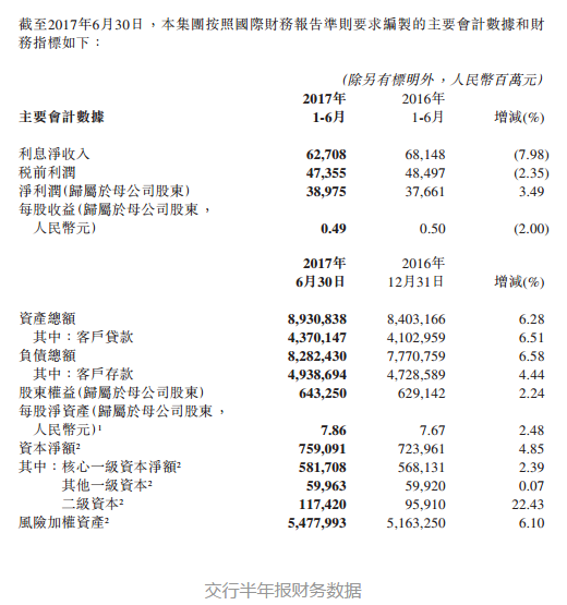 半年报内表示,报告期中集团实现净利润(归属于母公司)人民币389.75亿元,同比增长3.49%。资产结构不断优化,聚焦服务实体经济。积极跟进国家发展战略,做大社会融资规模。报告期末,集团客户贷款余额(拨备前)达人民币43,701.47亿元,较年初增加人民币2,671.88亿元,增幅6.51%。