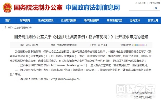 网络整理 2021-03-22 20:08网贷之家讯 8月24日,国务院法制办公室在其官网发布关于《处置非法集资条例(征求意见稿)》(下文简称征求意见稿)公开征求意见的通知,就中国银监会起草的《处置非法集资条例(征求意见稿)》向社会征求意见,意见提交的截止时间为2017年9月24日。
