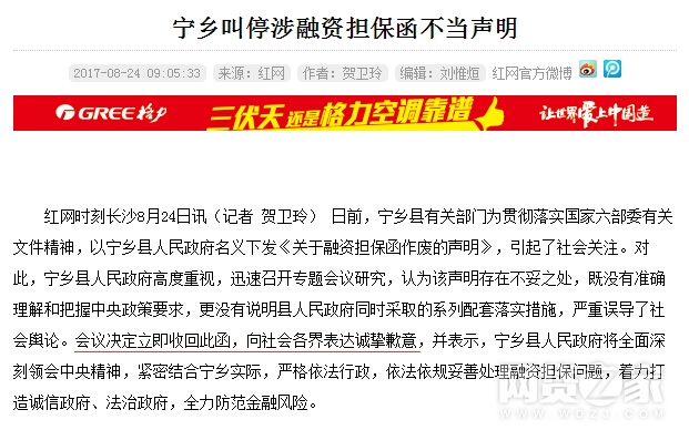 网贷之家注意到,8月23日,据《华夏时报》报道,当天,网上流传一份宁乡县人民政府关于融资担保函作废的声明刷屏朋友圈,与以往撤函不同的是,这次地方政府撤函显得简单粗暴,直接宣布所有担保函、承诺函全部作废。《华夏时报》记者从与相关机构处证实了此函的真实性。