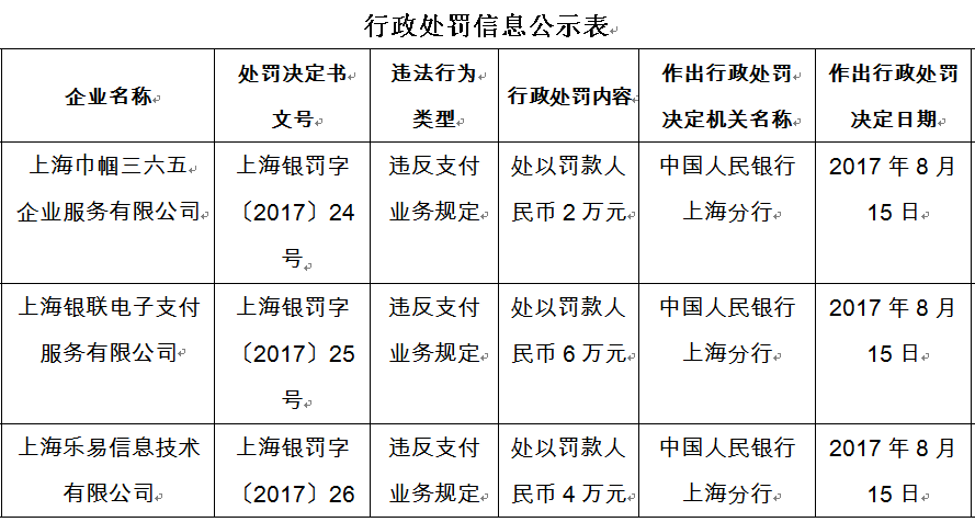 8、上海银罚字〔2017〕26号:上海乐易信息技术有限公司,违反支付业务规定被罚处以罚款人民币4万元。