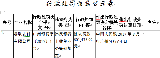 公告显示,易联支付在业务经营过程中存在对特约商户交易监测不足、未按规定设置收单银行结算账户等违规情况,导致合作的特约商户将支付通道转借给其他机构的事实。公司的上述行为已违反了《银行卡收单业务管理办法》的相关规定。