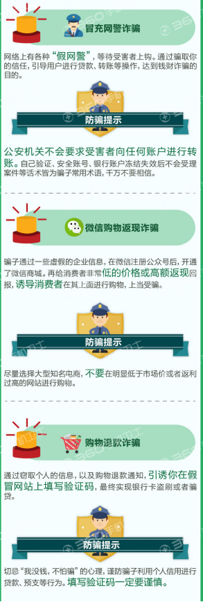 针对新型的电信诈骗方式,360手机卫士特别提醒用户,目前公共机关不会通过网络社交工具进行案件报案、受理、处理等工作,网络上所谓的网警皆为诈骗;网络购物时应尽量选择大型知名电商,不要在明显低于市场价或者返利过高的网站进行购物;不论是亚马逊、淘宝、天猫、京东等电商,都没有所谓的异常处理流程或退款流程,还有类似卡单、掉单等词语也都是诈骗专用术语;填写验证码时要看清验证码办理的业务内容,遇到办理不明业务的验证码,千万不要着急填写,可先了解该业务后再填写。